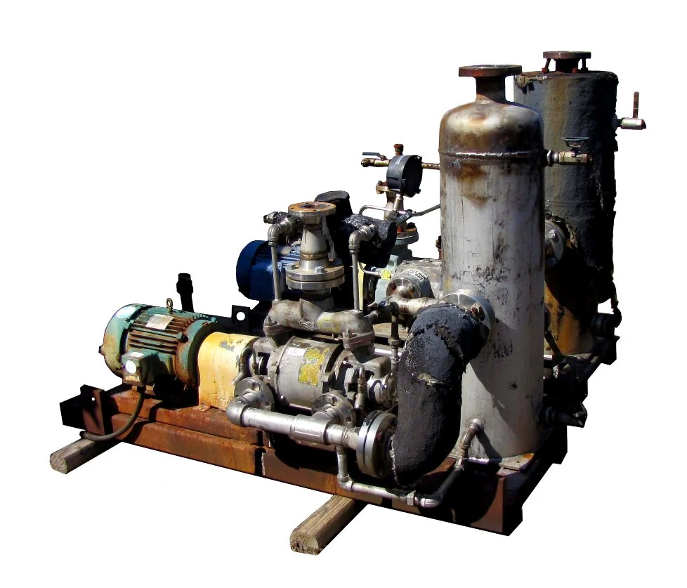 Nash Vacuum Pump, Size CL-202, Test No. 85Y003, RPM 1750, Rated 190 CFM @ 25" Hg. Stainless Steel (Picture of unit is the one with green motor in the foreground) Motor: Marathon, Model 4VK 215TTFS452BAN L, Encl. - TEFC, HP 10, Volts 230/460, Amps - 25/12.5, RPM 1760 With Basco heat exchanger, Type - 500, Size 05036, S/N - 9412979-0101, Part No. - 7A15A05036, Date - 09/94, Material of construction SS Also with SS receiver tank.