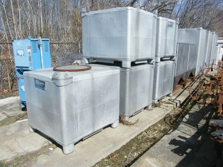 (4) Each, Hopper/Tote/Bin/Tank. Approx. 20 Cu.Ft. Aluminum (Al) bulk storage tote tank. 4' x 3'6" x 3' H. Stackable. Cone bottom with round 12" valve outlet. Center top opening with lid cover 24" diameter.