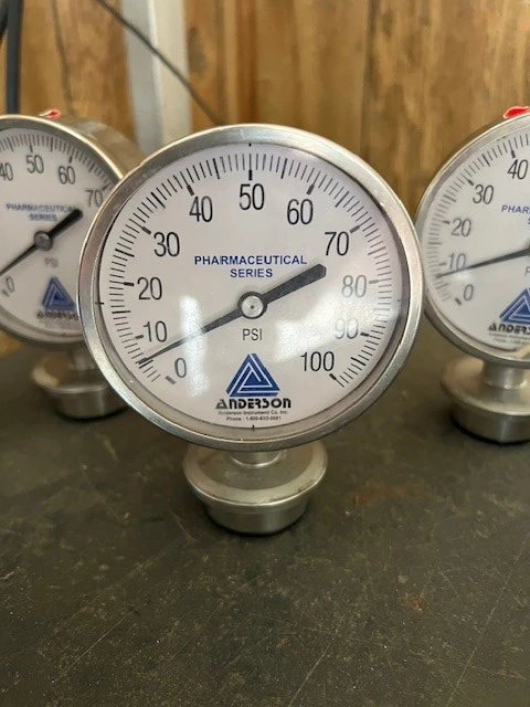 Lot of 4 Anderson Pressure Gauge, 100 PSI, Pharmaceutical Series. model# EM071011231021A. Serial# 0544314.
