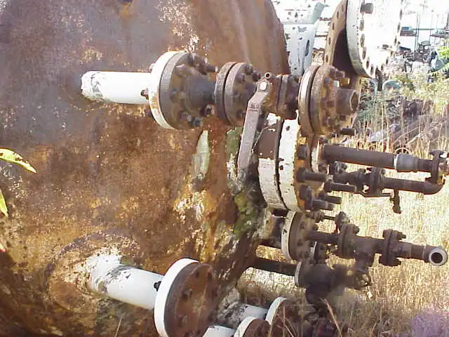 3000 Gallon high pressure Carbon Steel reactor vessel with jacket and internal coils: (19) rows 2" internal pipe coil. Rated 500 PSI/Full Vacuum @ 400 Deg.F. internal. Jacket rated 90 PSI/FV @ 400 Deg.F.. Top Openings 1-12, 1-3, 1-18w/bolted cover, 7-2, 4-4, 1-6. Has 3 Center bottom outlet.