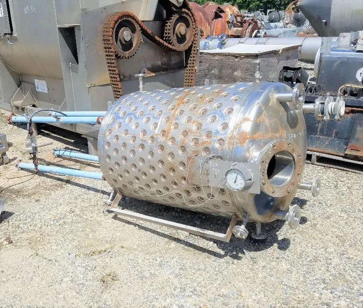 200 Gallon 304 Stainless Steel Reactor. Rated 30/Full Vacuum @ 100 Deg.F internal and 90 PSI @ 100 Deg.F Jacket. 3' dia. x 4' T/T. Built by Alloy Fab, NB# 65. Dimple Jacket. Mounted on legs. No mixer mounted.
