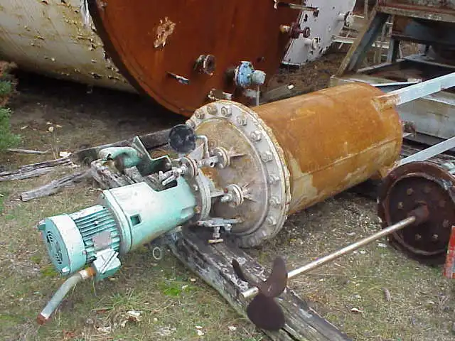 100 Gallon carbon steel reactor. With 1 HP Lightnin Mixer model N33G-100, s/n 6916523. Internal Rated 50/Full Vacuum @ 350 Deg.F.. Jacket rated 150 PSI @ 366 Deg.F.. NB# 4569 Flange mount. On 4 CS legs. OAH = 11'6