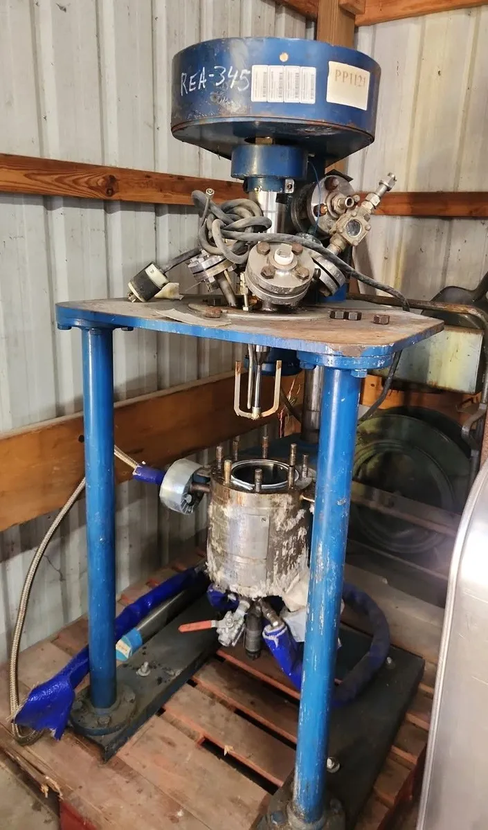 used approx 0.5 Gallon (2) liter Pilot Plant Reactor. Stainless Steel. Built by Autoclave Engineers. Rated 200/Full Vacuum @ 662 Deg.F. and -20 both internal and jacket. Stainless Steel contact parts. Approx 5" Dia. x 6" T/T. Top mounted mixer with 1.5 HP 208-230/460 1725 rpm motor into Shimpo Ringcone gear reducer. NB # 24146.