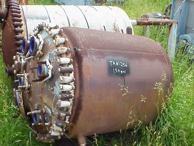150 Gallon Glass Lined, Carbon Steel Tank. Has clamp-on top. Full Carbon Steel Jacket.