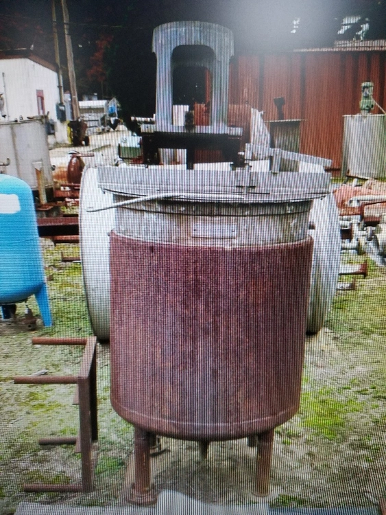 115 Gallon Stainless Steel Mix Tank. Has 3/4 CS Jacket rated 25 psi @ 267 degF. Also has Lightning Mixer model LD6150, s/n 565752 - drive missing. Tank sits on (4) CS legs down 15" from straight side. Bolt on flat top with 1/3 hinged opening.