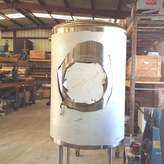 UNUSED 200 Gallon Sanitary Stainless Steel tank. Vertical. Dish top and Dish Bottom. Mounted on 3' legs. Approx. 34.5" Dia. x 4' T/T. Insulated and then shrouded in stainless steel. Approx. 3'6" OD and 8'6" OAH. Top has (4) 2" triclover fittings. side has (1) 2" near top and (2) 1" triclover for level gauge. Manway is 18" ID. CBO is 2.5" Triclover. Bottom outlet to floor is approx. 35".