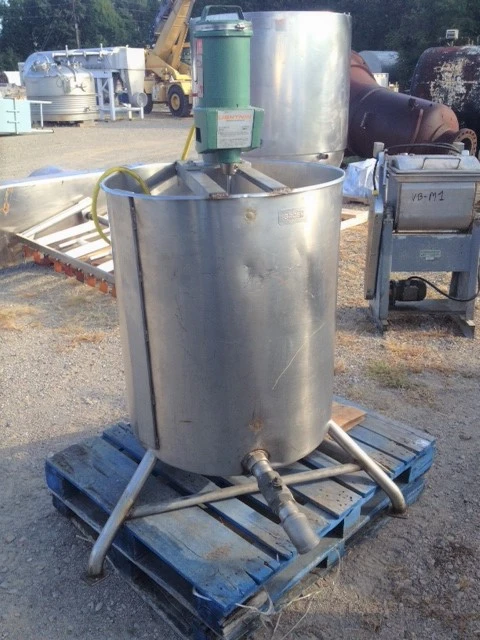 used 95 Gallon Stainless steel mix tank built by Groen. Model 95 gal SP. 30" dia. x 34" deep. Has top mounted Lightnin model XJ-43, S/N 92/B32260-04, .43 HP, 1725/1450 rpm, 208-230/460 volt motor. Approx 70" OAH. Side bottom outlet. Previously used in sanitary food plant (beef).