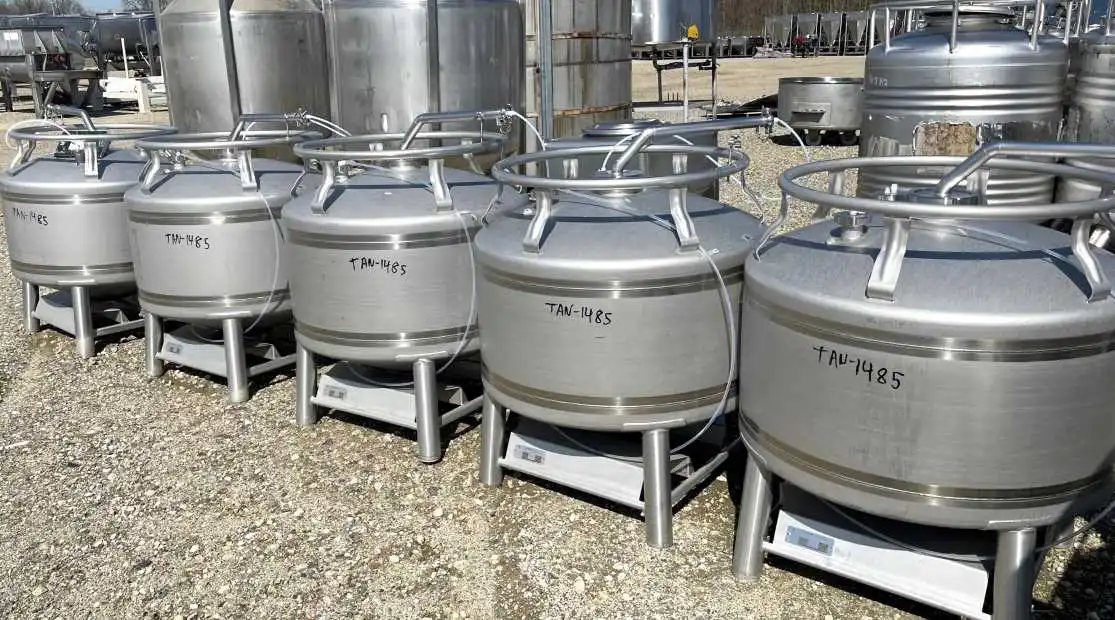 (2) 500 Liter (132 Gallon) UCON Portable Stainless Steel Pressure Tanks/Totes with forklift slots. Working Pressure -0.3/+0.5 Bar. 3'6" Dia.x 20" T/T. 46 OAH. Dish top with (2)-2" and 1-4" fittings. Cone Bottom with 1" outlet. Last used in sanitary flavors plant.