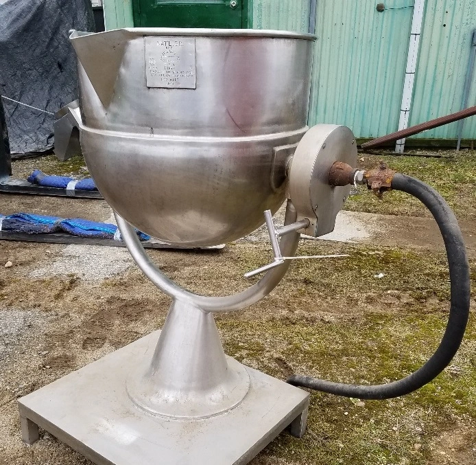 used approx. 30 gallon stainless steel jacketed GROEN kettle, tilt kettle. 24" diameter x 20" deep. On stainless steel stand. Jacket rated 40 PSI @ 650 degF.