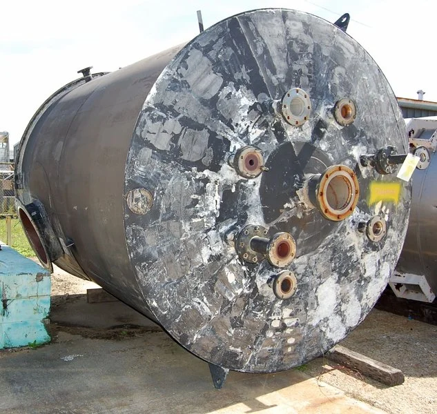 used 3500 Gallon Stainless steel tank. 8' dia. x 10' ht. Flat bottom and dome top. Openings on top: (5) 4", (1) 6", (1) 10". Side Openings: (1) 24" (No cover), (1) 4".