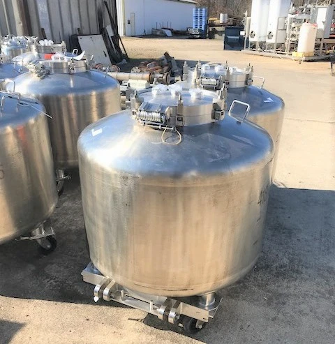 190 Gallon (720 Liter) Dairy Craft portable Totes/Vacuum Vessels. 42" Dia. x 26" T/T. Unit rated 25/Full Vacuum PSI @ 300 Deg.F. 1.5" CBO. 316L Stainless Steel. 18" Spring assisted lid. NB #'s. Units mounted on wheels. Units have tow hooks. Last used in a pharmaceutical plant in sanitary application.