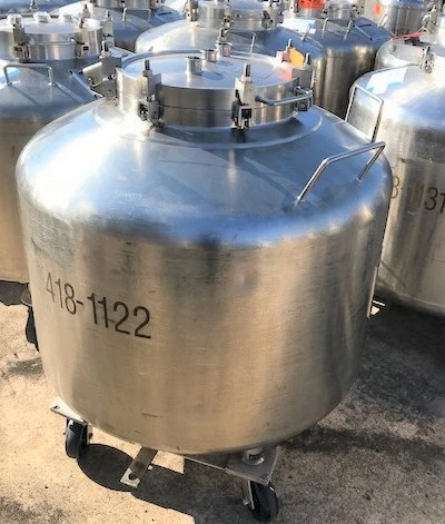 Used 190 Gallon (720 Liter) Letsch portable Tote/Vessel. 42" Dia. x 26" T/T. Unit rated 25 PSI @ 300 Deg.F. 1.5" CBO. Stainless Steel. 18" Spring assisted lid. NB # 183. Unit mounted on wheels. Last used in a pharmaceutical plant in sanitary application.