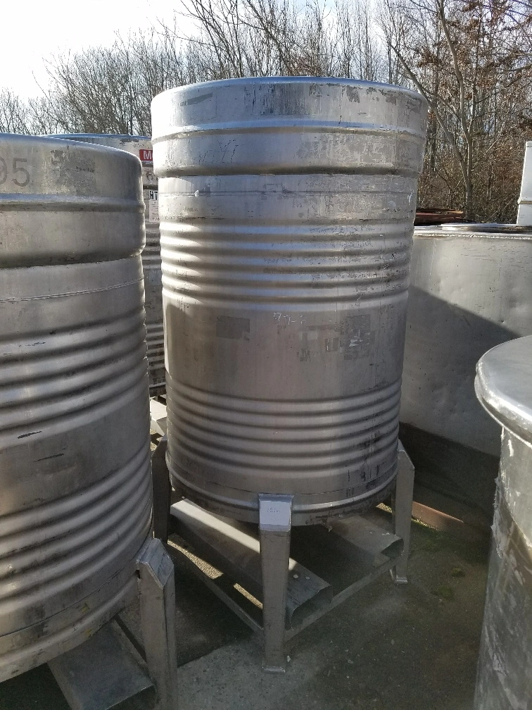 used 1000 Liter (264 gallon) Stainless Steel Sanitary tanks/Totes. 38" dia x 44" T/T (79" Overall Height). Cone bottom. Units have forklift slots, portable. 15 PSI working pressure. 2.5" outlet. (1) 16", (2) 2" and (1) 3/4" tri-clamp sanitary fitting on top head. Previously used in flavors and fragrance plant. Can be used for alcohol bottling, beer tank.