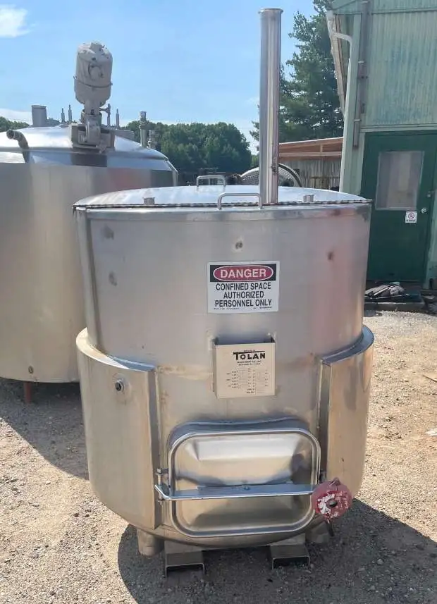 used Tolan 400 gallon Jacketed Stainless Steel Brew tank with filter plate. 4'dia.x 4' T/T. Flat top with hinged lid. Dish bottom. Unit has screen near bottom tangent line to keep solids from draining. Jacket rated 150/FV PSI @ 400 Deg.F.. Has 20" wide x 15" ht. clean-out door/manway. Has forklift slots. Jacket tested good.