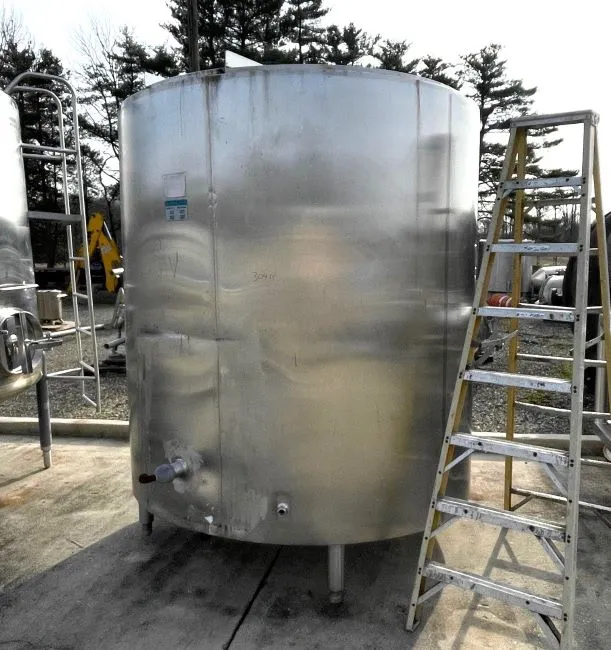 used 1500 Gallon Mueller Jacketed Stainless Steel Tank. 6'4" Dia. x 7' T/T. Jacket rated 90 PSI @ 300 Deg.F. Open top with lift off lids and Bridge to mount mixer. Has baffles. No mixer included. Sanitary construction. 2" side bottom outlet.