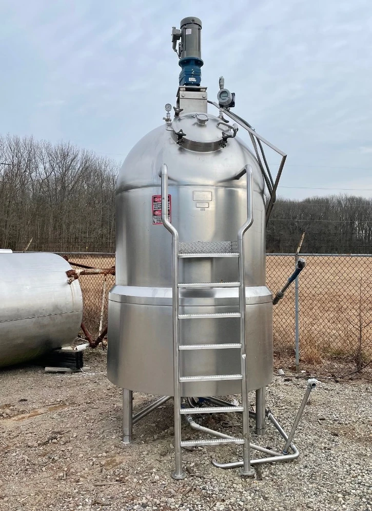 used 400 Gallon LEE Jacketed Vacuum Rated Distillation / Mix Kettle with Scrape Agitation. Model 400D7S. 316 Stainless Steel. Vacuum Pan. Sanitary Vessel Rated for Full Vacuum. Jacket Rated 90 PSI @ 332 Deg.F. Agitator is 3/2 HP, 230/460-190/380 Volt, 1760/1460 rpm into gear box with 18:1 ratio. National Board# 6444. Was going to be use as Vacuum Evaporator. Kettle is 13' OAH x 5'3" OD at the jacket. 3" CBO.