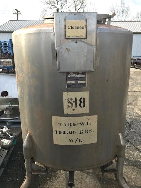 (1) Used 250 Gallon Permasan 316 Stainless Steel Portable tanks. 3'6" Dia. X 3'4" T/T (77" Overall Height) Dish top and Bottom. Mounted on wheels and has forklift slots. 2" Center bottom outlet. 17.5" top manway. Last used in sanitary food plant.