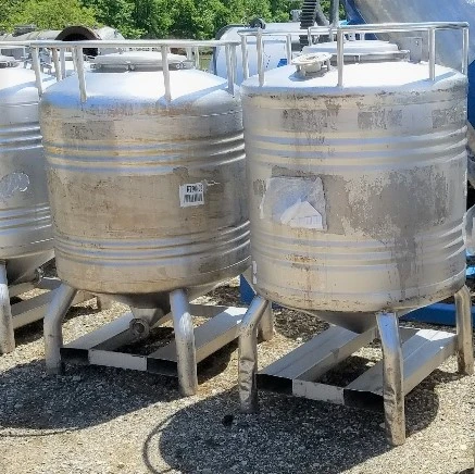 (5) used 800 Liter (~200 gallon) Stainless Steel Sanitary tanks/Totes. Built by Sharpsville Container. 40" diameter x 36" T/T, 66" OAH. Portable with forklift slots. 14.5 PSI working pressure. Approx. 2.5" outlet. Previously had pneumatic air mixer mounted on top (not available). Previously used in sanitary food plant.