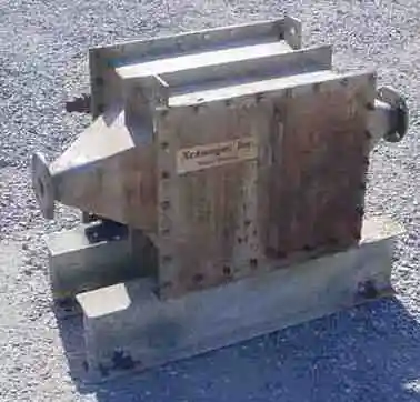 Xchanger Inc. heat exchanger used to heat and cool low pressure gas streams. Model C-100-2. Typical pressure 15 PSI (1 Bar). Air In 2", Air Out 2". Tube inlet 3/4", Outlet 1.5". Used to heat/cool/dehumidify by using Water/Refigerant/Steam/ect.