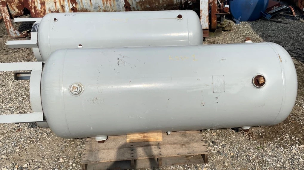 used 200 Gallon Air Receiver vessels. Rated 125 PSI @ 650 Deg.F.. 28" DIameter x 5'6" Straight Side (weld line to weld line). 8'2" Overall Height including legs. Built by Delta Mechanical.