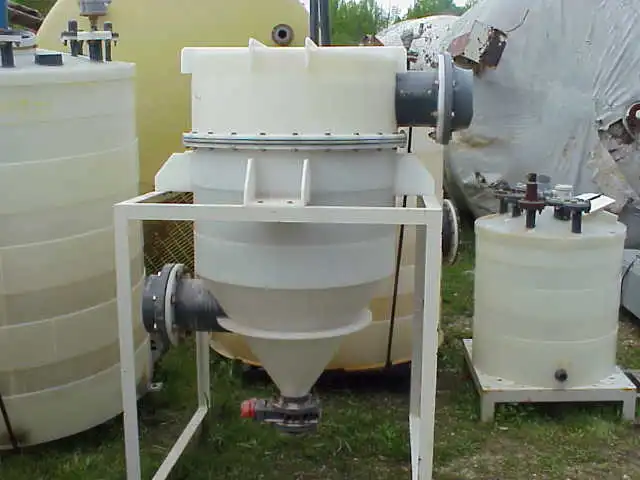 2 sqft. Poly dust collector. (4) elements at ~ 4" dia x 20" L. 8" inlet/outlet. 4" bottom valve. Pulse jet for cleaning.