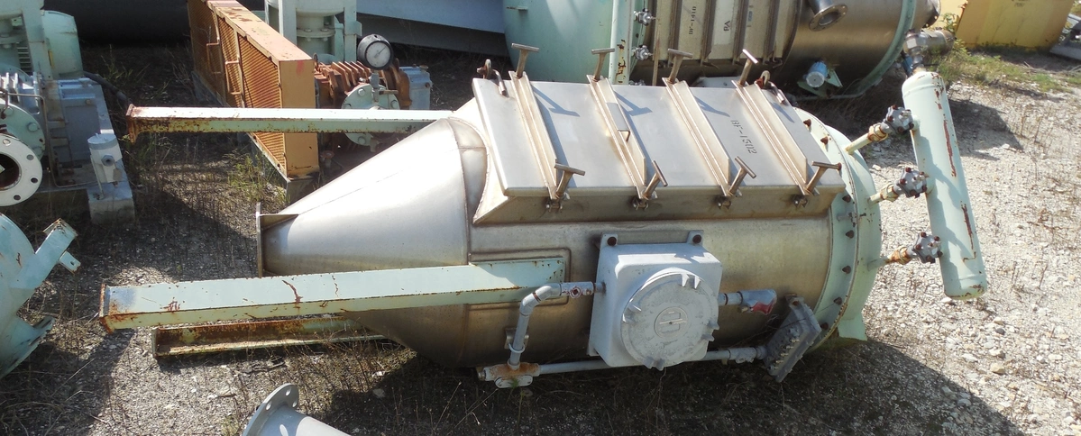 54 Sq.Ft. PECO Stainless Steel Dust collector/filter reciever. (9) 6" dia. x 42" Cages for bags. Rated 30 lbs/cu.ft. 30" Dia. x 3'10" T/T. Mounted on legs. ~7'6" OAH.