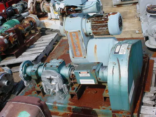 Used Moyno pump. Rated 10-50 GPM. Trim AAA. Driven by 5 hp motor thru Reeves Vari-drive, ratio 6.2, Min/Max RPM 68-680. Frame 1EOESI, Form GE.