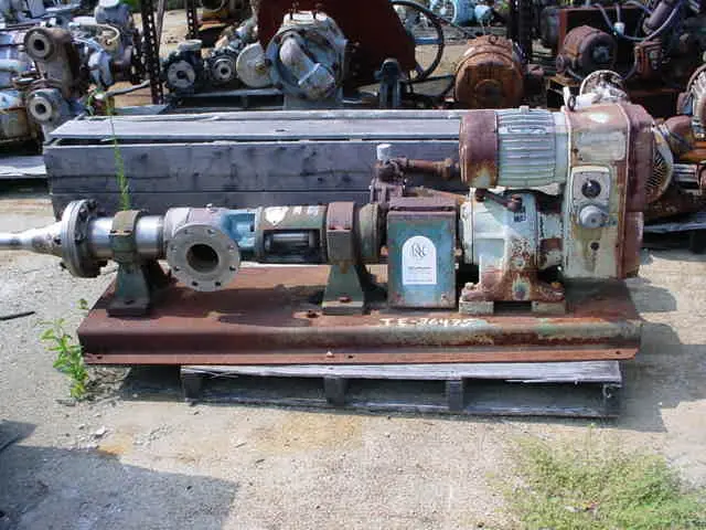 used Moyno Pump frame L-8, form EH. Driven by 5 HP, XP, 3/60/230/460V, 1735 rpm, frame 15-184T-21 motor thru 11.2:1 ratio varidrive. DIscharge reduced to 2".