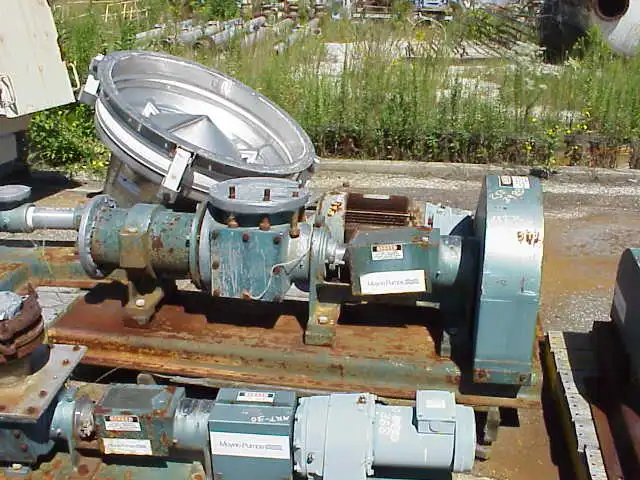 Moyno model SSQ, Trim AAA. Driven by 10 HP Reliance motor thru gear reducer 2.2:1 ratio, output RPM 780.
