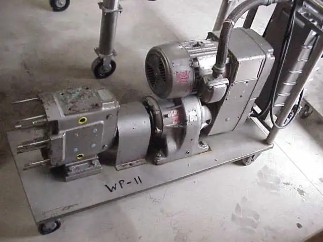 (1) Stainless Steel, rotary lobe, Waukesha Sanitary Pump. Size 60. Vari-drive (varible speed) motor, 3 HP, 230/460 V, 1730 RPMi, 48 - 483 RPMo, ratio 9.32:1. Has Allen Bradley XP (explosion proof) control panel. Portable on wheels. Missing head. (can be sold in parts, Waukesha Parts)