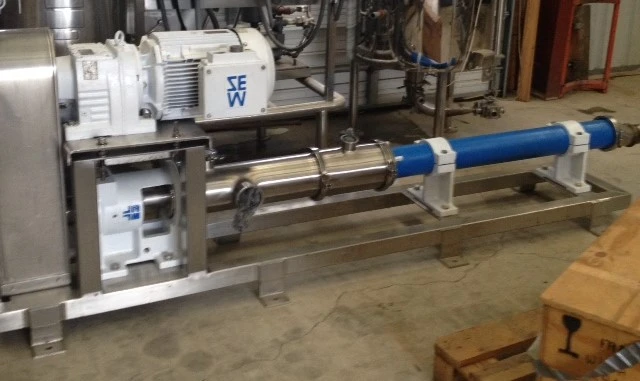 used MOYNO pump 4" Inlet/outlet with sanitary connections. Model 4CSG0ZZP1SJF3SBA. Rated approx. 20 to 35 GPM and from 175 PSI to 225 PSI. Mounted on base with SEW Drive. 20 HP, 1760 RPM, 230/460 volt motor into Gear reducer 13.33:1 ratio. s/n # AS2635700