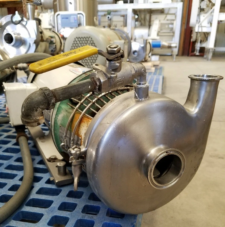 TRI CLOVER sanitary centrifugal pump Model C216MD18T-S, 2" x 1.5", driven by 5 HP, 3450 RPM. Stainless Steel. Previously used in sanitary food and beverage plant.