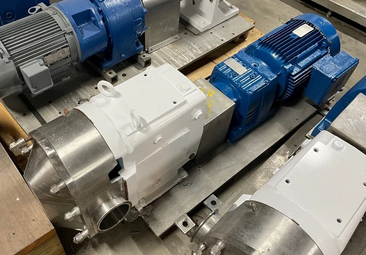 used Waukesha Cherry Burrell Model 220U2 Positive Displacement/Rotary Lobe Pump. Mounted on Stainless Steel Base. 4". Driven by 10 HP, 1740 rpm, 230/460 volt motor into gear reducer. Last used in Sanitary Food Plant.