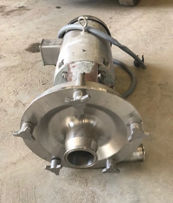 used Fristam Model FPR3451-250 centrifugal pump, Sanitary stainless steel. 3"x2". Rated approx. 250 GPM @ 30' Hd. S/N FPR345108022016. Driven by Baldor stainless steel clad motor 7.5 HP, 1770 rpm, 230/46 volt motor.