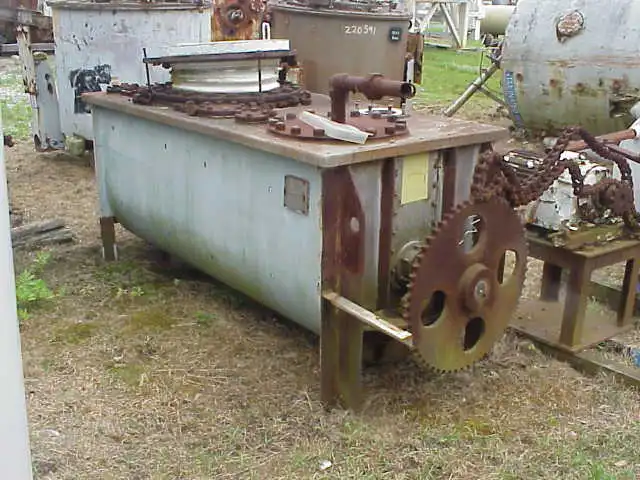 50 Cu.Ft. Stainless Steel Double ribbon blender. Stainless ribbon has bolt on teflon wiper. 10" Bottom end outlet. Chain driven. 17 RPM ribbon. 7.5 HP, 1740 RPM, 575 volt, 8.6 amp, motor into gear reducer ratio 20.9:1, 84 rpm output.