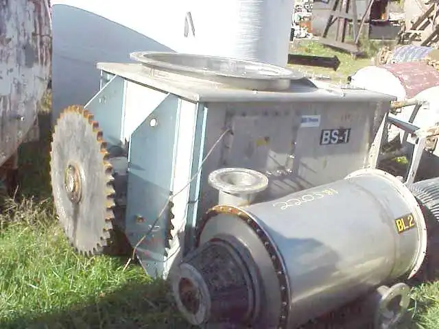 Stainless Steel 40 cu. Ft. double ribbon blender with a 6" x 92 twin-shaft continuous discharge feeder/ lump breaker/ de-lumper mounted in bottom of trough. Blender is powered by 2 HP motor. Continuous