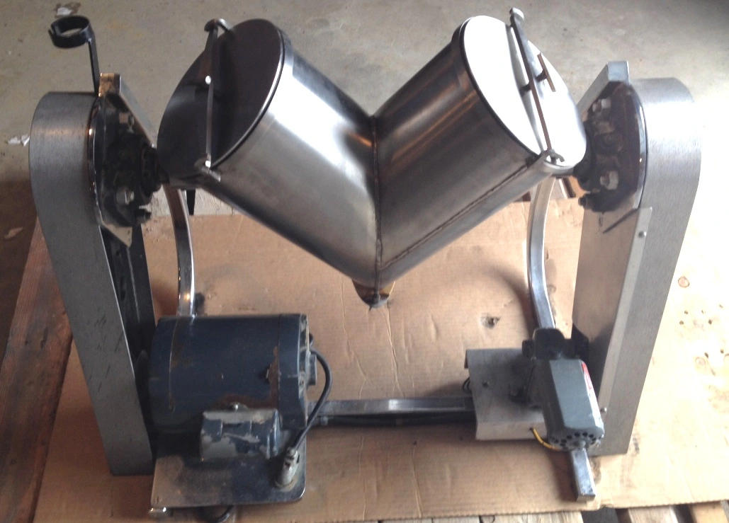 8 Qt. used, Patterson Kelley Twin Shell V, Liquid-Solids Blender. Stainless Steel. Unit has drive and provision for intensifier bar (bar not included). Bar drive is 3/4 HP, 3450 RPM, 115/230 v, 1 ph. Blender drive is 1/15 HP, 115 volt. Approx blender speed is 25 RPM. Laboratory blender, pilot scale blender.
