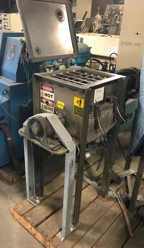 Used approx. 1 Cu.Ft Marion Type Paddle Mixer, Stainless steel. Equipped with electric blanket heater jacket. 12" wide X 14" long X 16" deep. Safety grate on top. Hinged top cover. 1/2 Hp 3 phase 60 cycle 230/460 volt, 1700 rpm motor with Sew Eurodrive reducer. 4" Center bottom discharge. Mounted with legs.