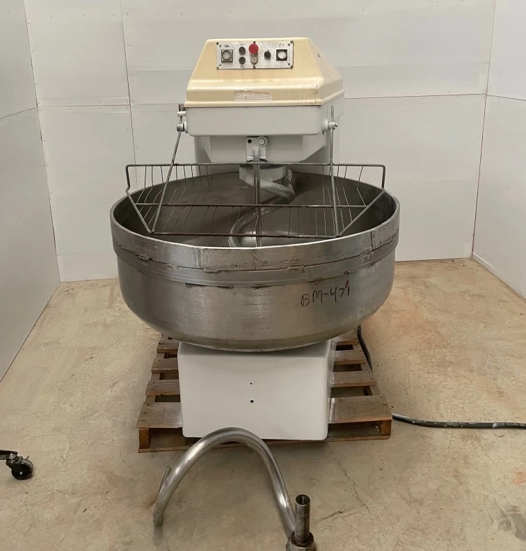 used Sigma 100 Gal. Spiral Dough Mixer, model B250. 43" Dia. x 18" deep Stainless Steel Bowl. Reversible. Video of unit running available.