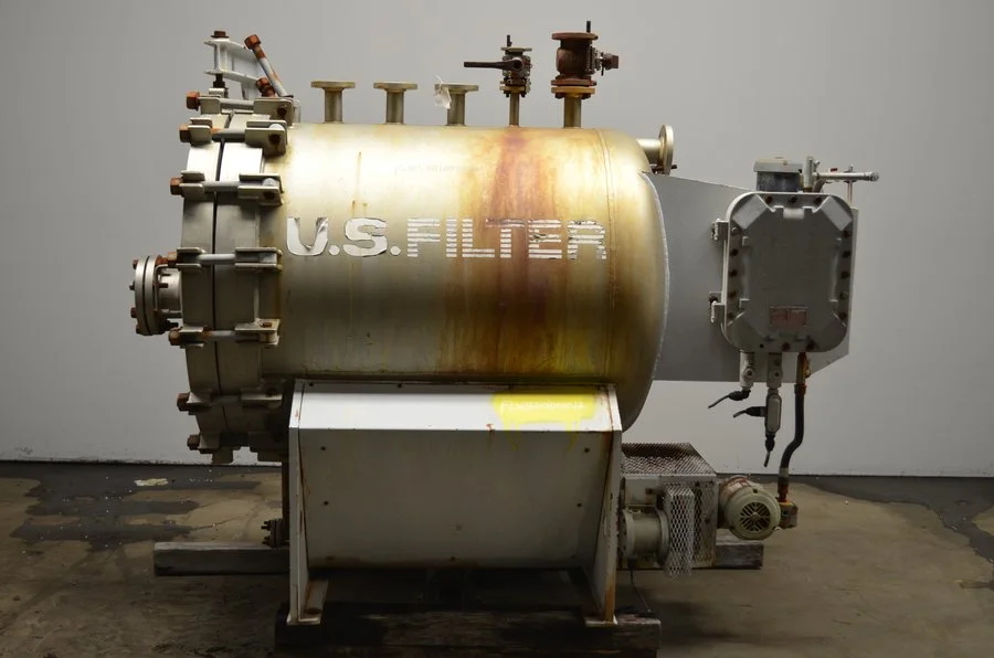 used US FILTER Pressure Leaf Filter. 3'6" dia x 4' straight side. Rated 150/FV PSI @ 250 deg. F. Min. Design Metal Temp. -20 deg. F @ 150 PSI. Hydro. Test @ 228 PSI. Serial Number 11-7853 Year 1997. No Elements. New elements can be ordered to suit.
