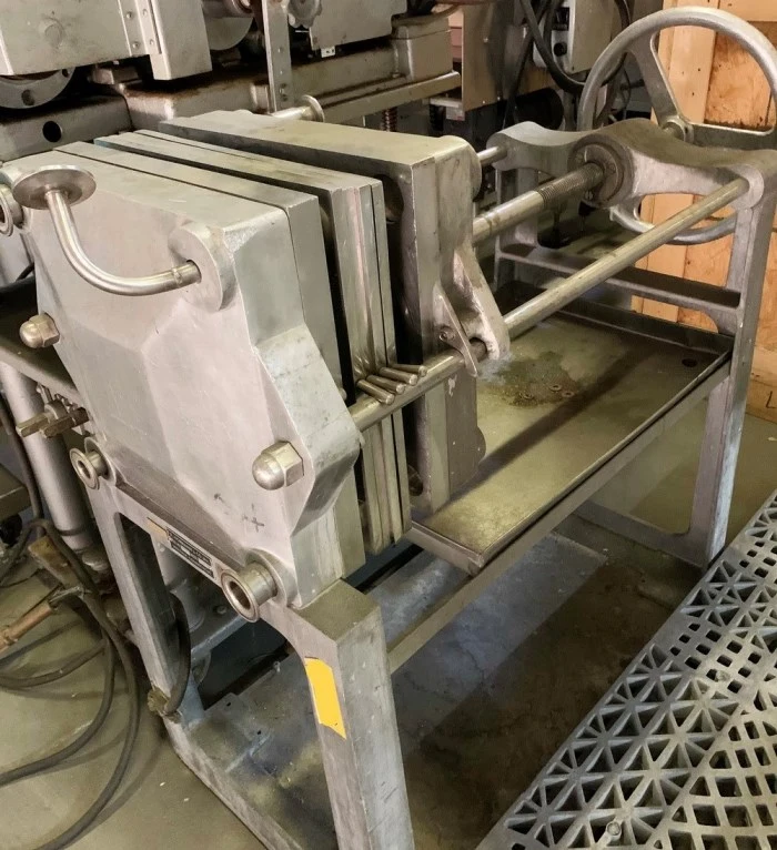 used Hormann Stainless Steel Plate and Frame Filter Press, Model ST-135. (4) 12" square plates plus end plates. Has handwheel closure, portable base, and drip pan. Apporx. 43" lgth. x 36" ht. x 18" wide. Last used in sanitary application.