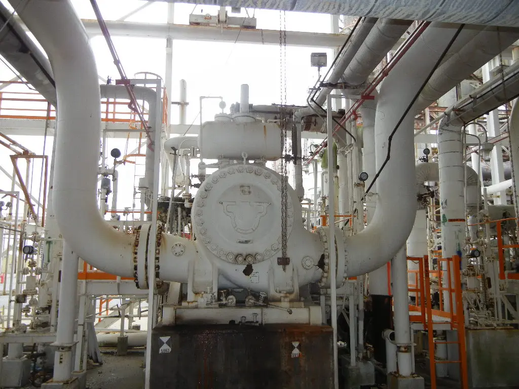 Used Cooper Bessemer Model RFB.24 Centrifugal 4800 HP Compressor. Syn Gas Compressor. 7550 RPM. Rated 25.7 MMSCFH. Suction Pressure 684 PSIA. Discharge Pressure 763 PSIA. Driven by Elliot Steam Turbine model SRV7 w/ 875 PSI @ 850 Deg.F Inlet pressure and 95 PSI exhaust pressure. Last used as MeOH loop Recycle Compressor in 1500 T/D Methanol Plant. (2) Available. Price is "as is where is". Spare rotor pictured is available for additional cost.
