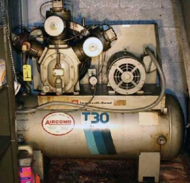 USED INGERSOL RAND MODEL T-30 APPROXIMATELY 20HP TWO STAGE THREE HEAD DESIGN RECIPROCATING AIR COMPRESSOR. FEATURES TWO LOW PRESSURE HEADS WITH 5-1/2" BORE AND 1" HIGH PRESSURE HEAD WITH 4" BORE ALL WITH 5" STROKE. RATED FOR 142 CFM PSI @ 870 RPM. 200 PSI MAXIMUM. RATED 117 ACFM @ 60 PSIG AND 115 ACFM @ 100 PSIG. BRUNNER ENGINEERING (BEDFORD IN) APPROXIMATELY 30" DIAMETER X 67" STRAIGHT SIDE 70" OVERALL LONG CARBON STEEL PRESSURE TANK RATED 200 PSI @ 450`F BUILT 2000. PRESENTLY HAS TOSHIBA 20HP 3/60/230-460 VOLT 51.2/25.6 AMP 256T FRAME MOTOR. INCLUDES FURNAS CAT #14FST32A NEMA 2 SIZE 3-PHASE 45 AMP MAGNETIC STARTER IN A FURNAS CAT #D35953-1 STARTER BOX. PREVIOUSLY USED FOR 30HP 460 VOLT. CHANGED TO 20HP 220 VOLT TO CONFORM WITH BUILDING REQUIREMENTS. S/N 30T-504812. AS IS. OAD: 44" WIDE X 72" LONG X 70" HIGH. 1400# WEIGHT. WILL CONSIDER ALL OFFERS