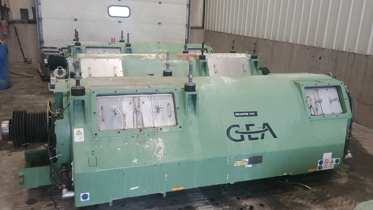 Used Westfalia CB505-71-32 solid bowl horizontal decanter centrifuge. Bowl 500/265 mm/19.685" diameter X 84" long. (2) Phase. Centripetal pump liquid discharge with GEA Varipond P design for adjusting pond depth on the fly. 316L Stainless steel contacts. Main drive 150 HP. Back drive 20 HP (missing motor). Max bowl speed 3500 RPM. Lube system with pump and plate exchanger.
