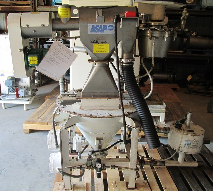 used Sweco Rotary/Centrifugal Sifter model K300C. Screen is approx. 5" dia x 12" L. 4" inlet, 4" screw auger feeder. Unit comes with MAC hopper with level indicators, bin vibrator and impulse valve. Previously used in sanitary application for coffee grinds.
