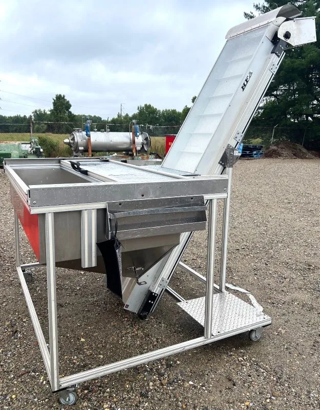 Portable Stainless Steel Inclined Belt Conveyor/Feeder 22" wide built by HFA Conveyors. 93" high Discharge. 75" OAL. inlet hopper is 6' wide and 44" long with a 30" depth. 101" OAH. 1.5" H belt cleat. 7.5" between each cleat. 22" belt width. Appears Unused.