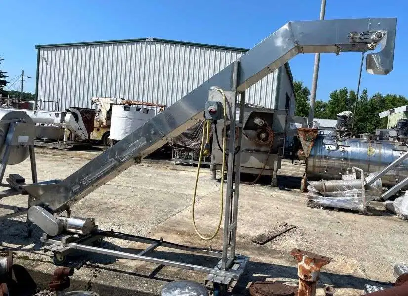 Portable Stainless Steel Belt conveyor 10" wide. 81" high Discharge. 11'6" OAL. inlet hopper is 20" wide and 28" off the ground. 97" OAH. No belt included. Has .75/.5 HP, 208-230/190 volt Stainless steel motor into 25:1 gear reducer. Last used in sanitary food plant.
