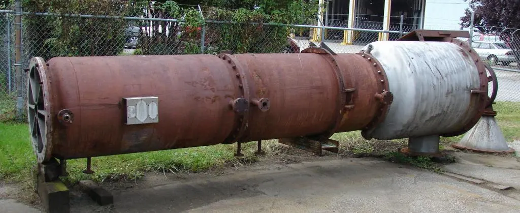 Rodney Hunt 97 sq ft, Turba-Film thin film evaporator. Constructed of 316 stainless steel. Serial number T-30-144-63-1, National Board # 287. Thin film evaporator is rated for 150 psi @ 400° F on the jacket and 15 psi @ 400° F internally. Evaporator has a 4" flanged conical positive discharge, 3" flanged product inlet, and a 15" flanged vapor discharge. Overall dimensions are 4' diameter x 22' long. Good condition.