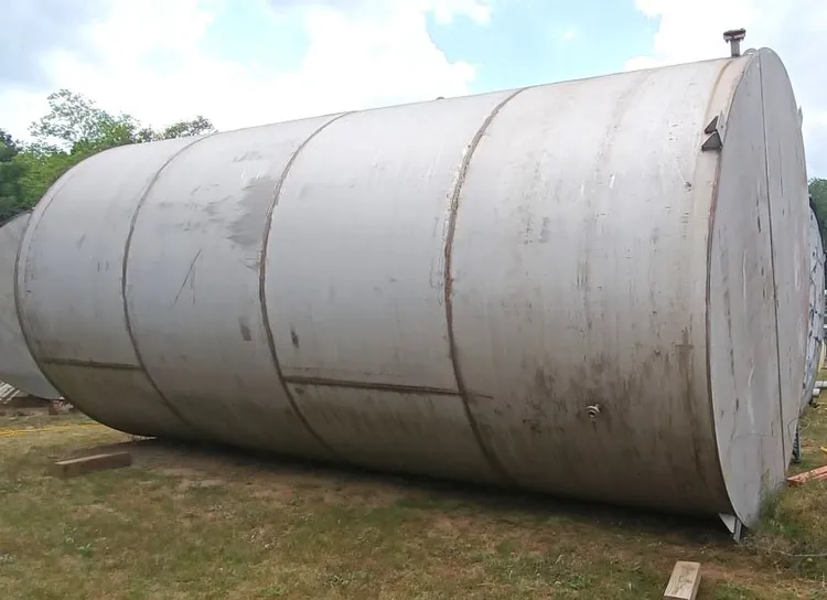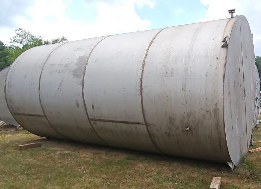 Used 20,000 Gallon Stainless Steel Tank with internal coils. 304SS. Flat bottom. 4 loops of 2" heating coils. 12 ft outside diameter x 24' Striaght side. Bottom is 0.375" thick, top is 0.25" thick, sidewall is estimated at 0.375" (calculated from dimensions at side manway. Total height is approx. 26' from bottom to top of vent pipe.