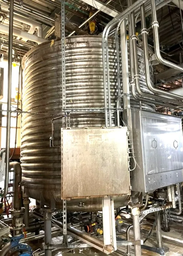 3000 Gallon Jacketed 316 Stainless Steel Dish Bottom Mix Tank. 8' Dia. X 7' T/T. Half Pipe Stainless Steel Jacket. 2 HP, 230/460 volt Lightnin Series 10 Mixer. 3" Center bottom outlet with valve. Has slight cone top. Mounted on legs. Last used in Health/Nutritional/Biomedical Collagen products.
